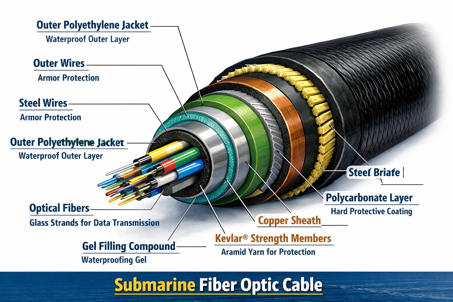 Although submarine cables are invisible to the average user, they are marvels of engineering. From the outside, a modern subsea cable looks deceptively simple — about 25 millimeters (roughly one inch) in diameter, no thicker than a garden hose, and weighing around 1.4 tonnes per kilometer. But cut one open and you find layers of sophisticated protection. At the very center are ultra-pure silica glass optical fibers, each as thin as a human hair, capable of transmitting data as rapid pulses of laser light. Modern submarine cables typically contain between 4 and 48 fiber pairs and often use G.654 fiber specifically designed for long underwater distances, achieving signal loss as low as 0.15 to 0.17 dB/km — far better than standard land-based fibers. Surrounding the glass core is a stainless steel tube filled with protective gel, then successive layers of copper conductors (for powering repeaters), nylon, steel wire armor, and tar for waterproofing.